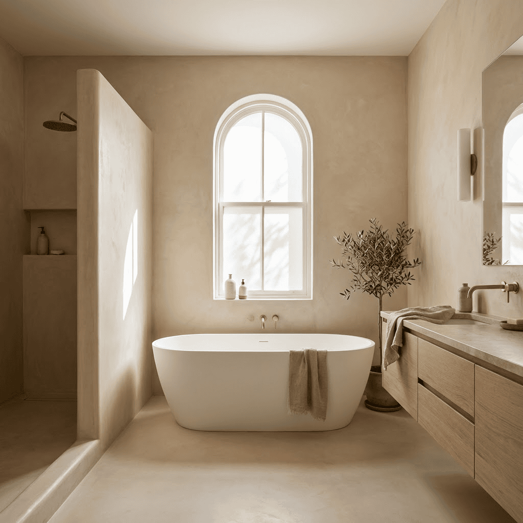 Its appeal isn’t just technical. Tadelakt has depth. It feels warm under light. It softens corners and curves. It creates a continuous surface that feels sculpted rather than assembled.