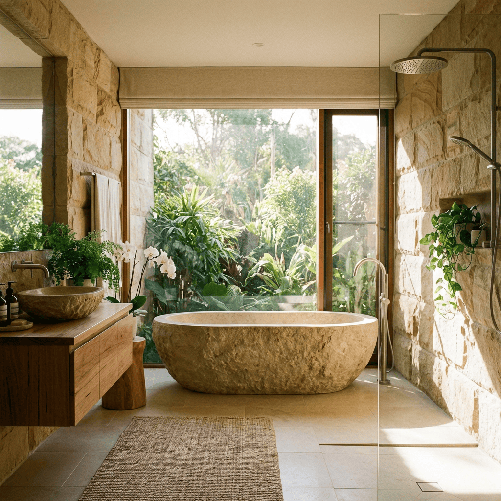 Freestanding tubs, stone sinks, and curved design elements create a soothing and natural aesthetic. In kitchens, curved islands or natural stone backsplashes can soften the space and mimic forms found in nature.